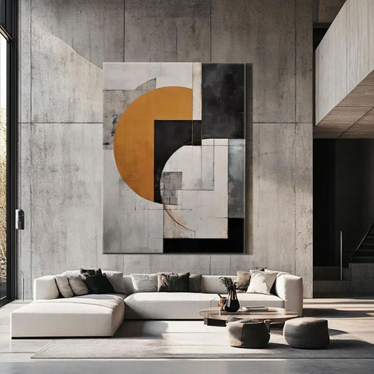 Geometric Gray & Orange Abstract Oil Painting – Minimalist Mid-Century Modern Hand-Painted Wall Art