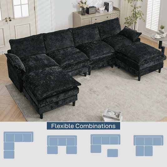 Modular Sofa, U Shaped Cloud Couch Comfy Set ,6-Seater, 2 Armrest Pillows, Convertible Sectional Couch, Chenille (2 Movable Ottoman), Black