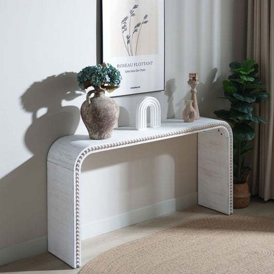 59" Washed White Waterfall Console Table – Curved Entryway Table with Wood Bead Accents