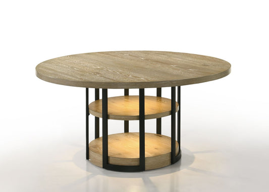 Eden 7Pc 59" Round Rustic Oak Dining Set with LED Light, Black Metal Table Frame, Shelves, Beige Linen Chairs