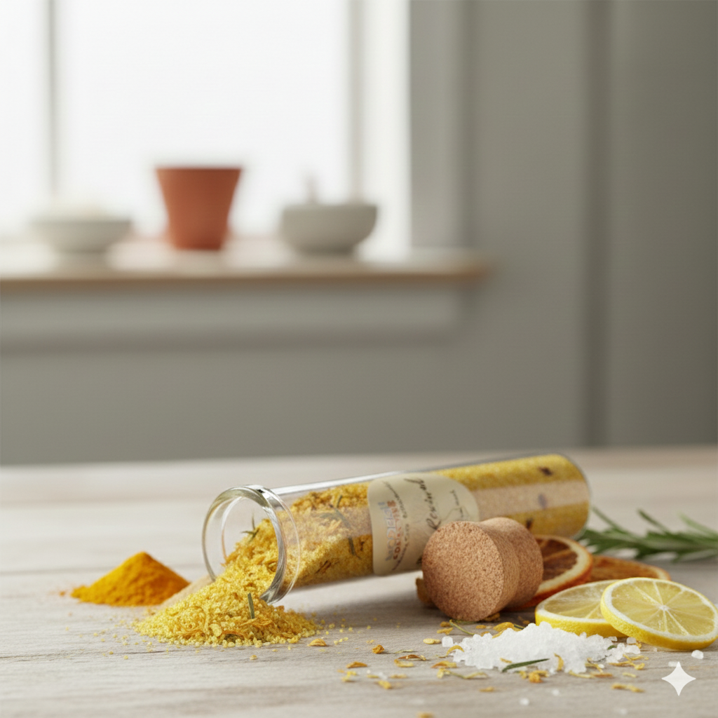 An uplifting detox bath sand infused with turmeric, ginger, magnesium flakes, and bright citrus oils to energize the body, restore clarity, and support lymphatic flow.